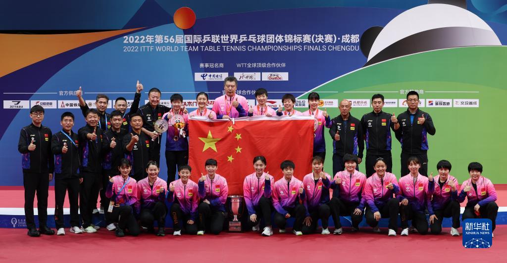新华社成都10月8日电(记者陈地)8日晚,备受关注的2022年第56届世界乒乓球团体锦标赛女团决赛上演,中国队三名队员陈梦、王曼昱、孙颖莎发挥出色,3:0完胜日本队,帮助中国队以八战全胜的骄人战绩夺冠,并实现世乒赛五连冠。