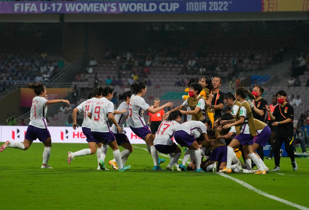 下半场刚开始两分钟,中国队也获得点球良机,黄嘉欣在对方禁区内突破被绊倒,随后乔睿琪冷静主罚命中。第90分钟,替补登场不久的两名中国队员打出精妙配合,葛钰送出妙传,余星悦突入禁区后推射将比分改写为2:0。