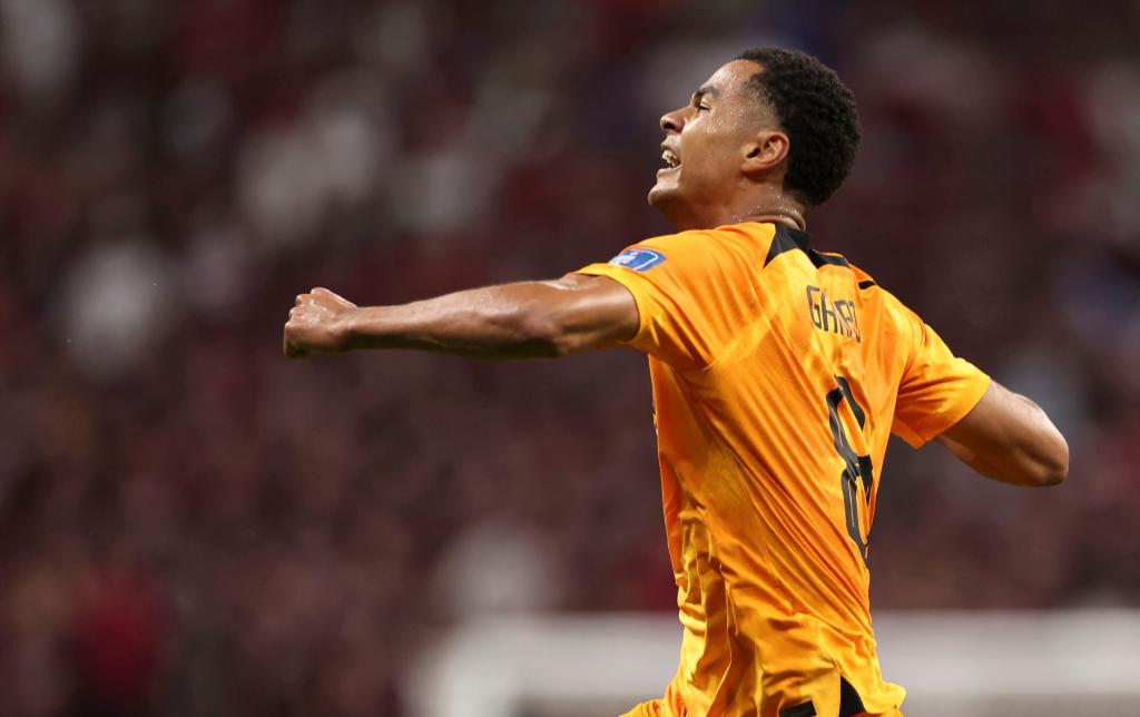 11月29日,荷兰队球员科迪·加克波在比赛中进球后庆祝。新华社记者 徐子鉴 摄