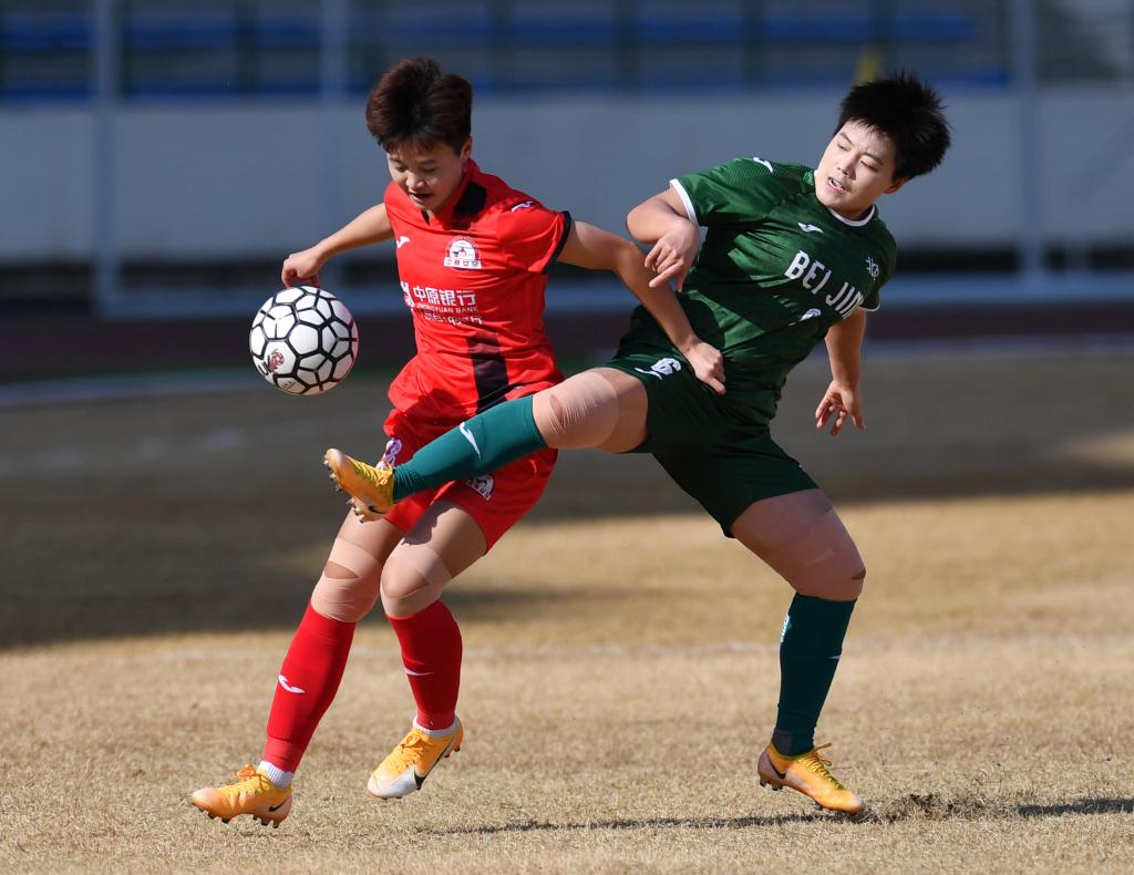 3月4日,北京女足队球员马晓兰(右)与河南中原女足队球员樊梦霏在比赛中拼抢。新华社记者 李嘉南 摄
