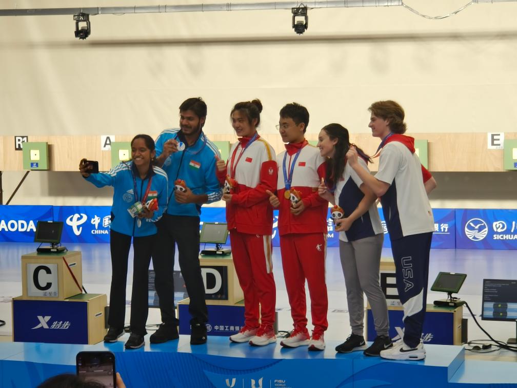 当天,射击赛场的颁奖仪式现场变成了全场一起庆生的欢乐景象。在10米气步枪混合团体项目获得银牌的印度姑娘瓦拉里万站在领奖台上,在“生日快乐”的祝福声中,伴着现场观众的掌声,与一同参加颁奖仪式的中国、美国选手们拍照留念。