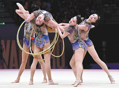 中国艺术体操队的良好状态延续到最后一个比赛日。在5圈单项决赛中,率先登场的中国队高质量地完成整套动作,以36.550分获得金牌,为中国艺术体操队赢得首个世界冠军。在随后进行的3带2球单项决赛中,中国队依旧发挥亮眼,以32.800分收获一枚银牌。