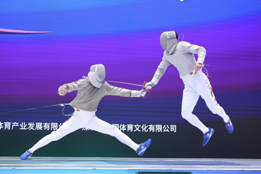 代锐(左)在男子佩剑个人决赛中对阵林霄