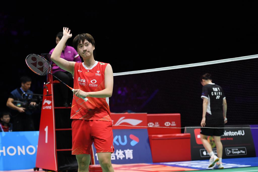 女单冠军的争夺在中国队选手陈雨菲和韩悦之间展开。两人前两局战至1:1后,韩悦因伤退赛。