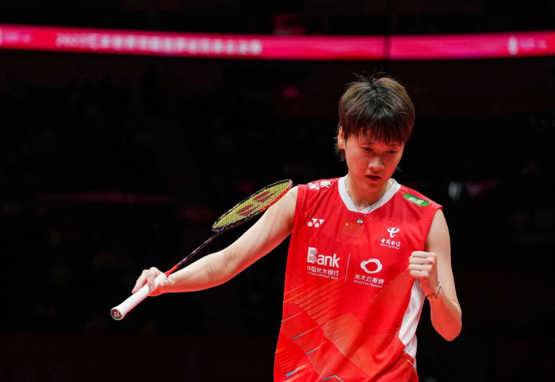 12月14日,陈雨菲在比赛中庆祝得分。新华社记者 孙非 摄