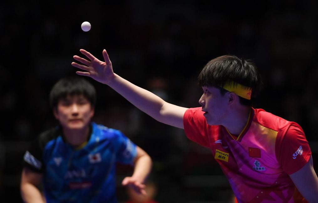 2月22日,王楚钦(右)在第二盘比赛中发球。新华社记者 陶希夷 摄