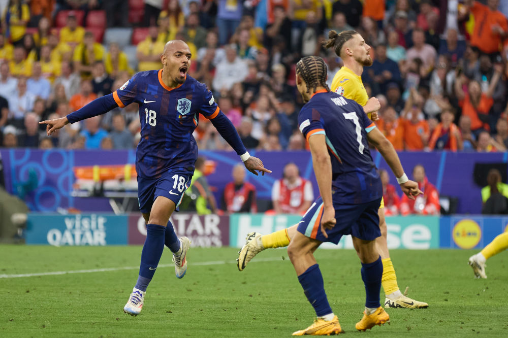 7月2日,荷兰队球员马伦(左)在比赛中庆祝进球。当日,在德国慕尼黑进行的2024欧洲足球锦标赛八分之一决赛中,荷兰队3比0战胜罗马尼亚队,晋级八强。新华社记者 孟鼎博 摄