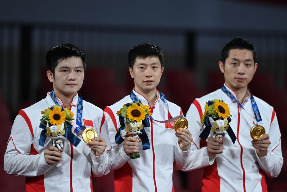 2021年8月6日,中国队选手马龙(中)、许昕(右)、樊振东在颁奖仪式上。当日,在东京奥运会乒乓球男子团体决赛中,中国队以3:0的总比分战胜德国队,夺得冠军。新华社记者 黄宗治 摄