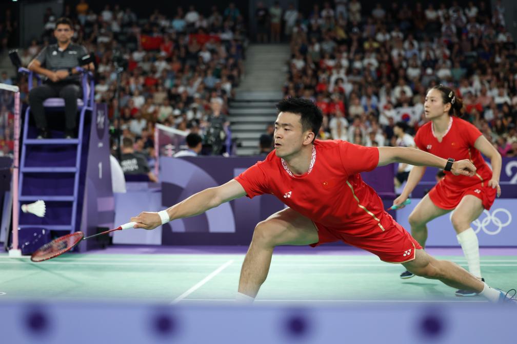 8月1日,中国组合郑思维(前)/黄雅琼在羽毛球混合双打半决赛中。新华社记者 陈斌 摄