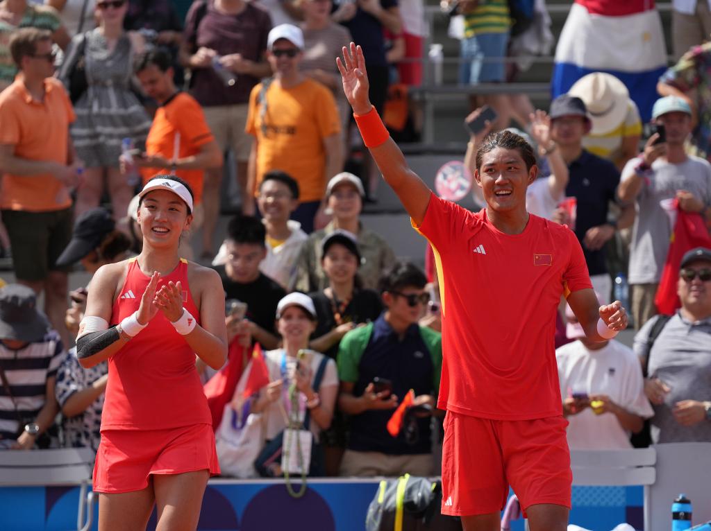 8月1日,王欣瑜/张之臻在网球混合双打半决赛后庆祝。新华社记者 万象 摄