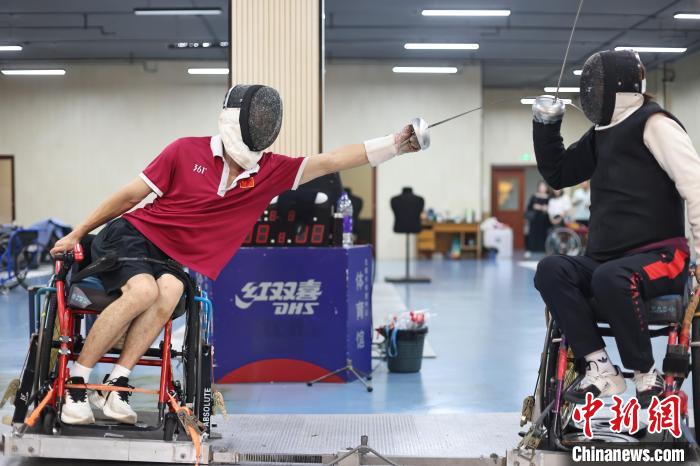 即将出征巴黎残奥会的击剑运动员仲赛春(左)与队友胡道亮练习击剑动作。中新网记者泱波 摄