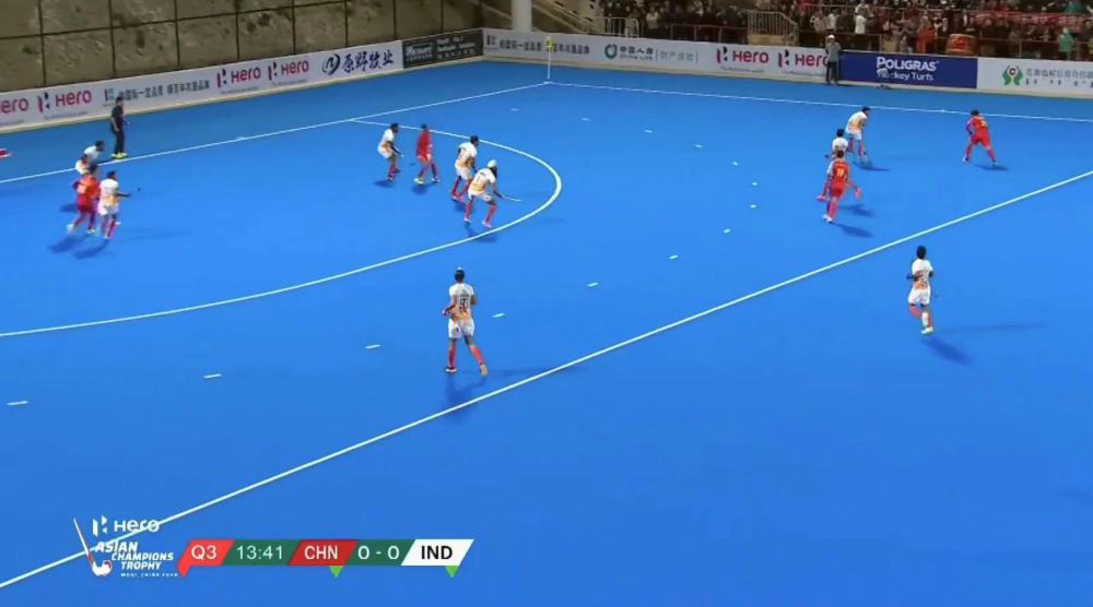 在冠军争夺战中,中国队迎战实力强劲的印度队。比赛一开始,双方便展开激烈对攻,印度队几次制造威胁,均被中国队轻松化解。第一节比赛进行到10分钟左右时,印度队连续获得两次短角球机会,但均未能取得进球。随后印度队试图通过长传配合射门,也被中国队守门员成功防住。