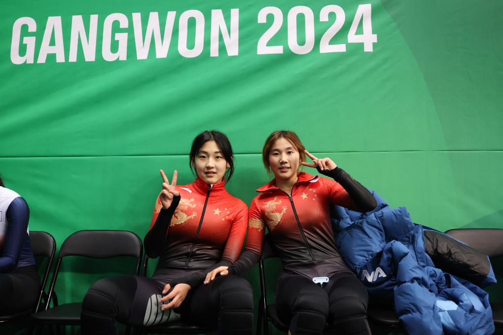 1月20日,中国选手杨婧茹(右)与李金恣在比赛后庆祝。当日,在韩国江陵进行的2024年江原道冬青奥会短道速滑女子1500米决赛中,中国运动员杨婧茹和李金恣分获金、银牌。新华社记者 许雅楠 摄