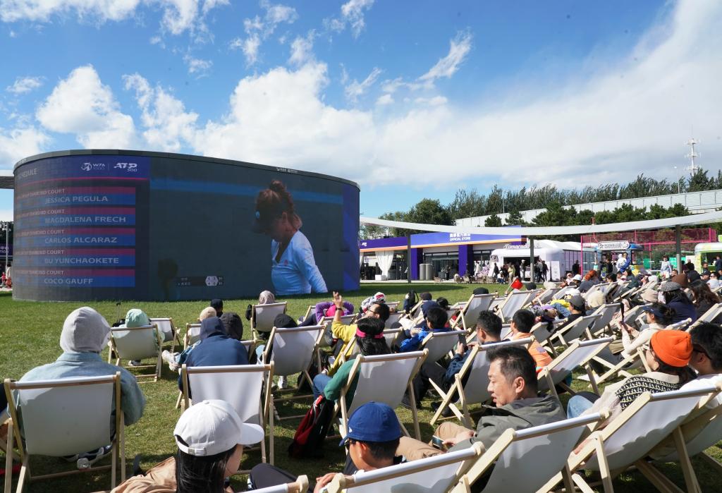 10月1日,在北京国家网球中心,游客在躺椅上观看中国网球公开赛赛事直播。新华社记者 张晨霖 摄