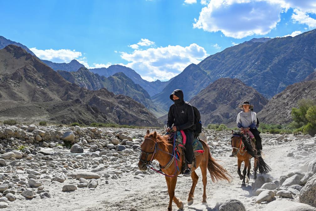 6月9日,游客骑马进入乌孙古道体验。当日,在新疆阿克苏地区拜城县,2024年新疆“跟着赛事去旅行”乌孙古道国际徒步露营大会启动。新华社记者 陈朔 摄