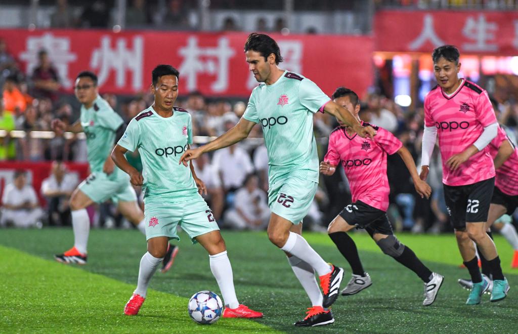 5月27日,卡卡(中)在“逐梦”冠军明星公益赛中。当日,“逐梦”冠军公益赛在贵州省黔东南苗族侗族自治州榕江县“村超”球场举行。新华社记者 杨文斌 摄