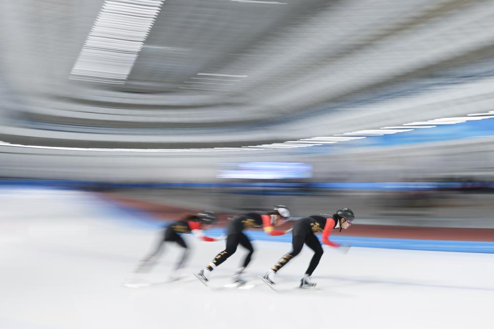2024年12月15日,2024-2025赛季中国杯速度滑冰精英联赛第四站暨亚冬会测试赛女子团体追逐比赛在黑龙江省冰上训练中心举行。新华社记者 张涛 摄