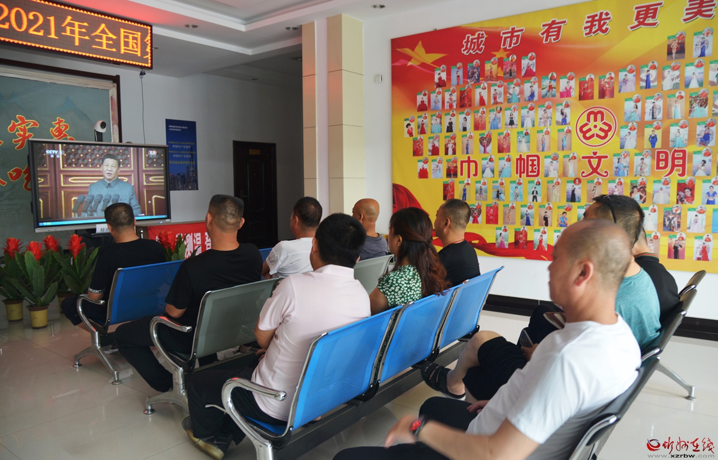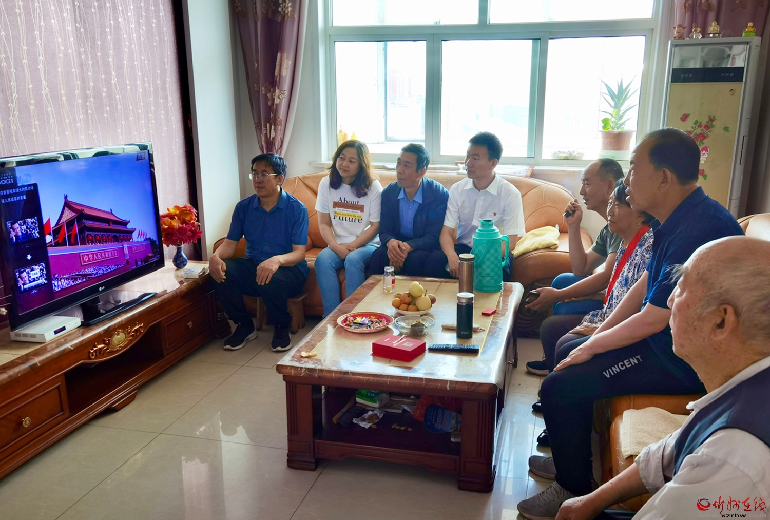 忻府区桥西街街道办事处试验场社区组织收看。张苏霞 摄