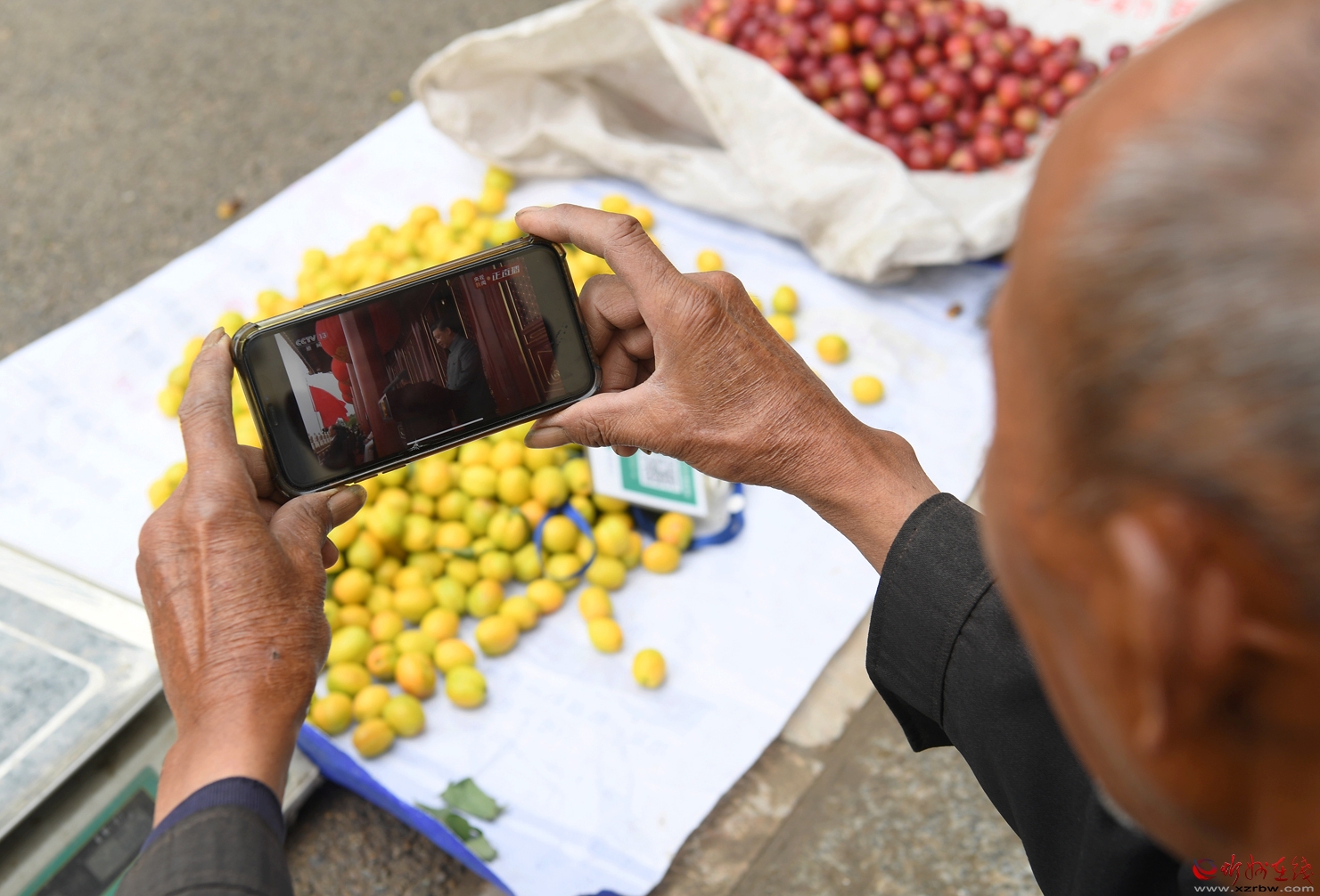 定襄农贸市场卖杏老农收看。张晋兰 摄