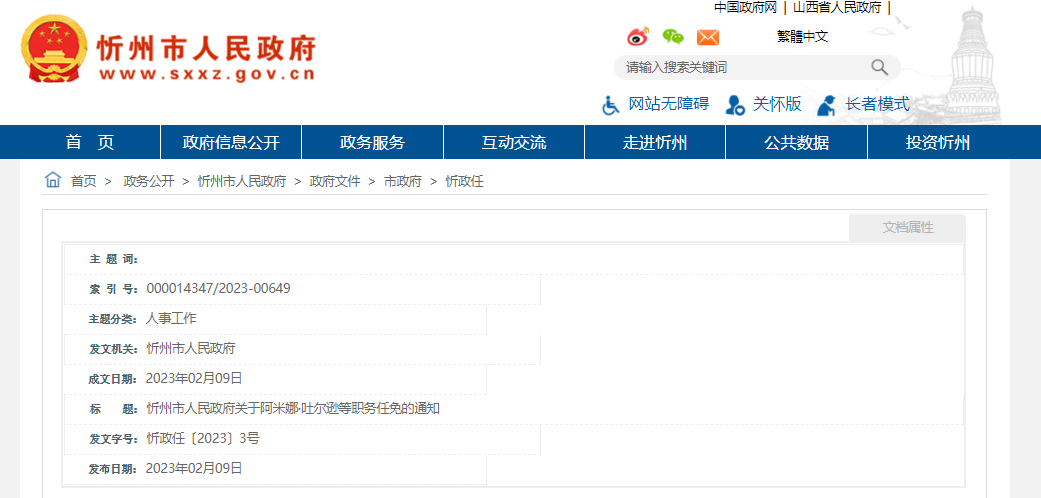 忻州市人民政府关于阿米娜·吐尔逊等职务任免的通知
