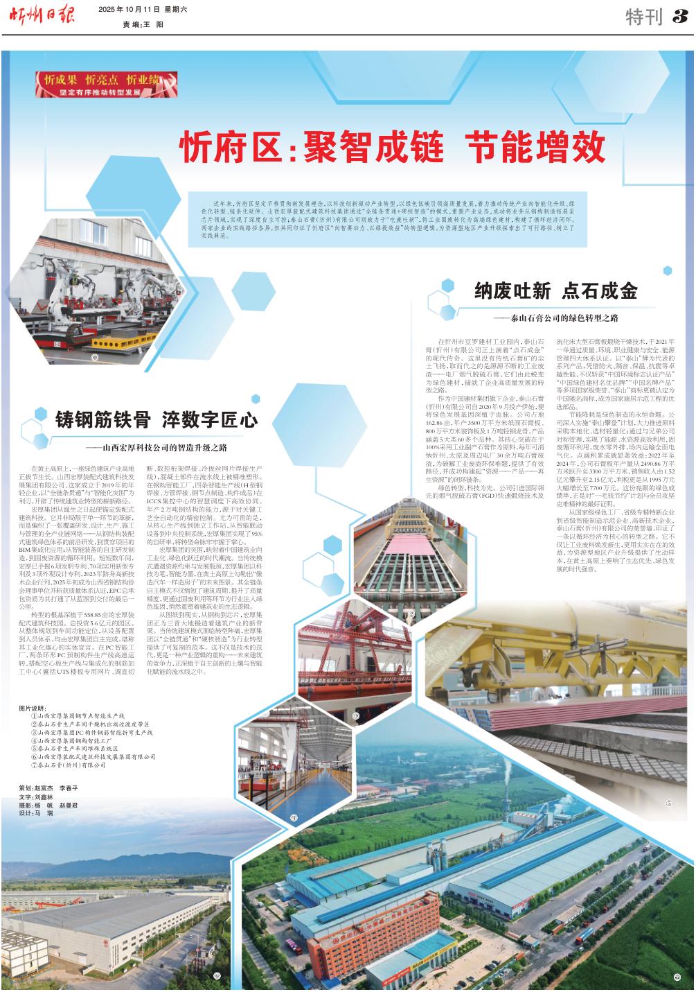 近年来,忻府区坚定不移贯彻新发展理念,以科技创新驱动产业转型,以绿色低碳引领高质量发展,着力推动传统产业向智能化升级、绿色化转型、链条化延伸。山西宏厚装配式建筑科技集团通过“全链条贯通+硬核智造”的模式,重塑产业生态,成功将业务从钢构制造拓展至芯片领域,实现了深度自主可控;泰山石膏(忻州)有限公司则致力于“吃废吐新”,将工业固废转化为高端绿色建材,构建了循环经济闭环。两家企业的实践路径各异,但共同印证了忻府区“向智要动力、以绿提效益”的转型逻辑,为资源型地区产业升级探索出了可行路径、树立了实践典范。