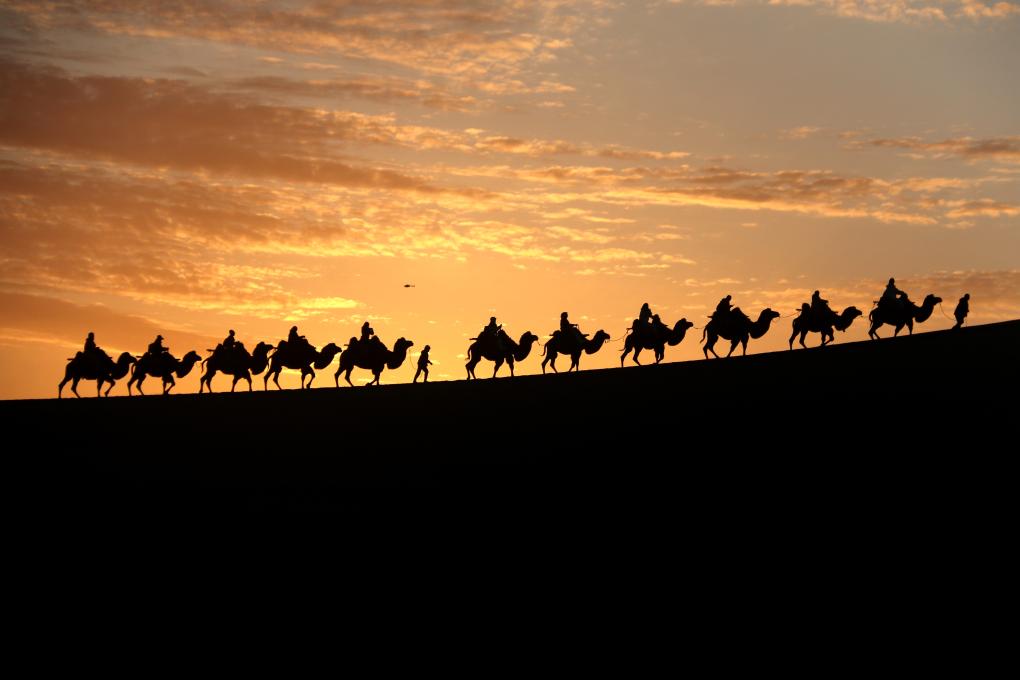 月牙泉是沙漠的眼睛,依旧倒映着汉唐的明月。驼队曾经从这里经过,驼铃声串起长安与罗马的梦。丝绸是流动的彩虹,瓷器是凝固的月光,经卷里藏着智慧的种子,在欧亚大陆上生根发芽。