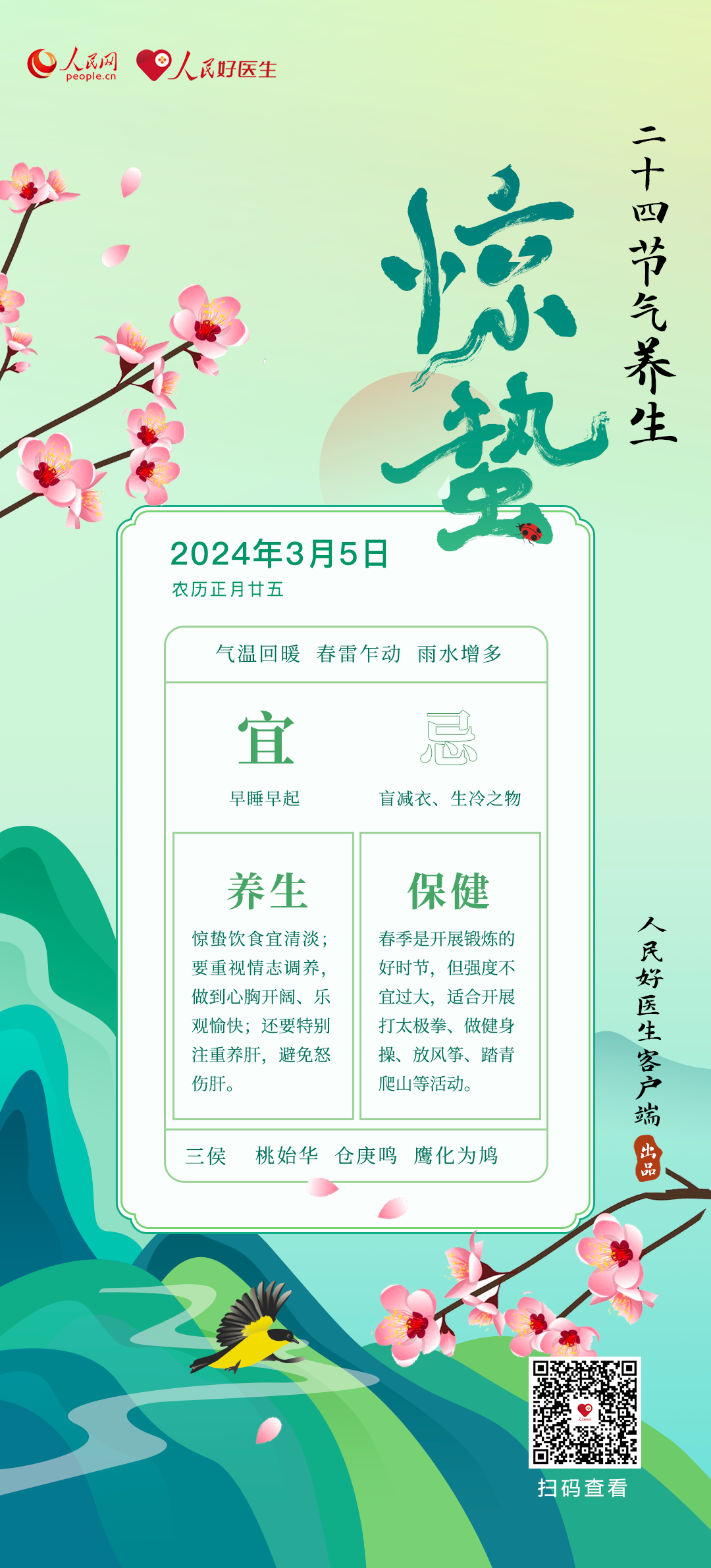 —年有四时变化,有24个节气的更替,不同的节气有不同的气候,这些气候变化与人体健康息息相关。《个人健康手册(二十四节气)》系列,是人民网·人民好医生客户端邀请知名中医专家,根据二十四节气的变化规律,通过防病调理、饮食养生、运动按摩等,调整人体节律,平衡阴阳,与自然界的阴阳变化相应,从而达到健康养生的目的。想了解更多惊蛰养生知识,请点击查看《个人健康手册(二十四节气·惊蛰篇)》。