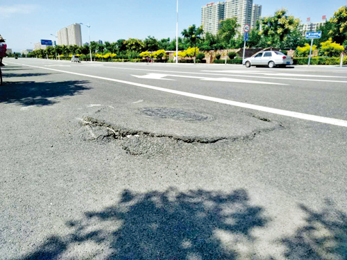 城区雁门大道南街与团结中街北巷交叉路口,有一下水井盖周边严重破损,多处裂缝,存在安全隐患。希望有关部门尽快予以修补。张林全 摄于8月24日
