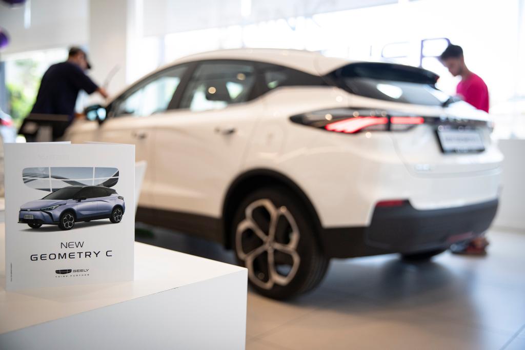 这是6月21日在以色列特拉维夫一家吉利销售点拍摄的新款几何C电动车型。当日,吉利汽车在以色列发布新款几何C电动车型。新华社记者 陈君清 摄