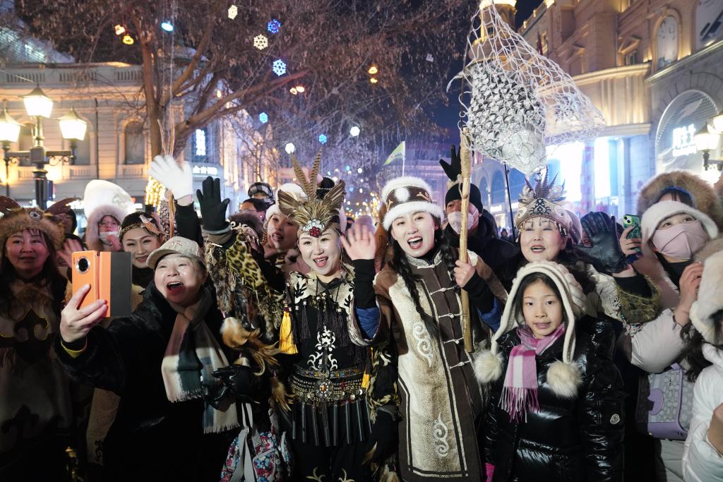 1月6日,身着赫哲族服饰的赫哲族群众和饶河县文旅推荐官在哈尔滨中央大街上与游客互动。新华社记者王建威摄