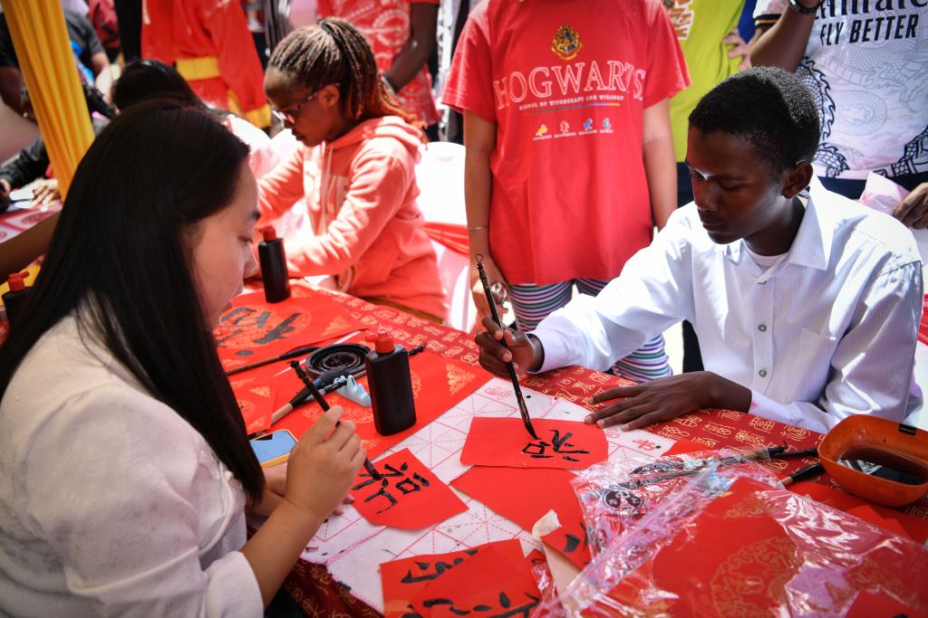 2月10日,在肯尼亚首都内罗毕,人们在内罗毕中国春节庙会上体验中国书法。(新华社记者韩旭 摄)