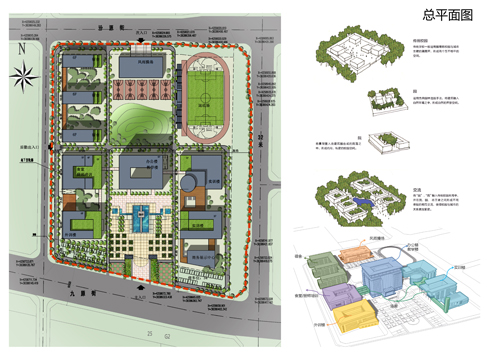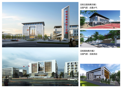 我们本着国匠精神-九宫格布局、山水格局-背山面水、四水归堂的设计理念,团结上学、振兴技校的精神,努力将本项目打造成为忻州市的新名片,圆技校学生一个大学梦。我们注重整体空间的舒适性、艺术性,不强调过分统一。设计中注重细节处理和学生们行为模式的考虑;将环境气氛和设施布置的更具有灵活性、亲和力,适应宽松、生活化的教学模式。