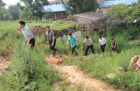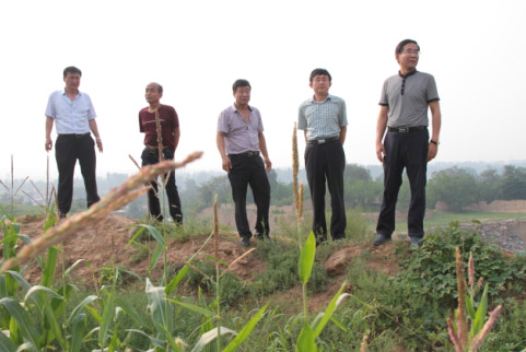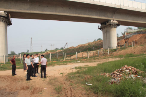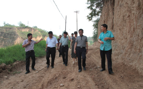 7月29日烈日炎炎,忻州气温高达30多度,下午16时许,忻府区区长赵志伟,副区长宁康平,忻府区国土资源局局长白蕾,解原乡党委书记丁国仓,乡长王万荣和相关部门负责人,带着忻州市委、市政府,忻府区委、区政府对东社村村民的关怀,赶赴解原乡东社村实地了解情况。区长赵志伟一行人驱车直奔现场,徒步来到村东南角高铁架空桥下,认真察看高铁架空桥下积水形成滩涂地段和防洪渠现状后,漫步爬坡而上,走到村东南土方堆放处神台沟(地名)。亲自爬上高约7、8米的土堆,沿土堆一直走到源头察看了积水情况,经过对现场地形以及土堆源头积水情况的细致调研,一行人汗流夹背地返回村口,连口水也来不急喝就开始认真地分析问题。