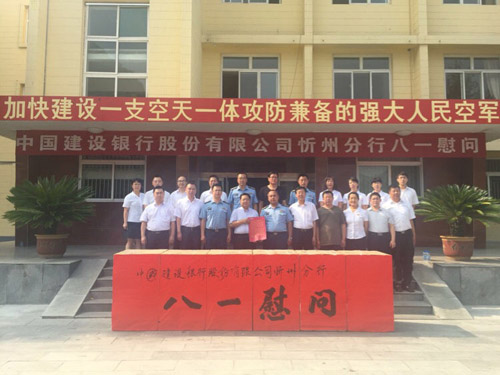 7月31日,八一建军节来临之际,忻州分行刘昱星行长携纪委书记陈庆鹏、副行长赵彤、高级客户经理王平、副行长郝翀平及部分部门负责人前往空军某部开展“军银携手,共建同行”八一慰问活动,并递交慰问信和慰问品。