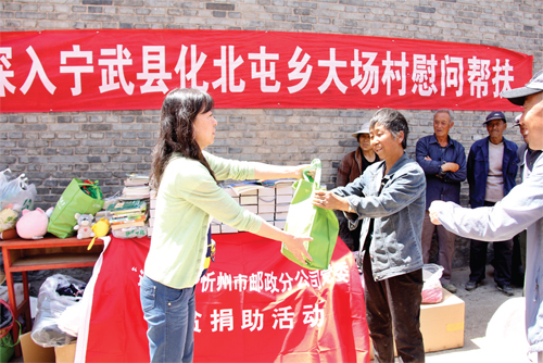 本报讯 在“ 七一”建党节到来之际,忻州邮政分公司党委选派部分党员志愿者、职工代表奔赴宁武县化北屯乡大场村开展献爱心帮扶捐助活动,将爱心衣物384 件、书法用品60 盒、儿童用品20 件、各类书籍161 册、现金1490 元通过乡扶贫办移交给该村村委会。村民们看到送来的捐助物资,都很感动,心里觉得很温暖。