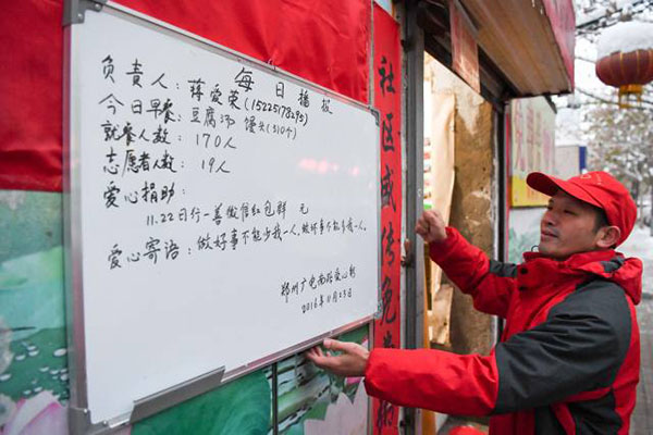图说:志愿者在悬挂“每日播报”,将早餐内容、就餐人数等信息公布在爱心粥屋门口(11月23日摄)。图片来源:新华社