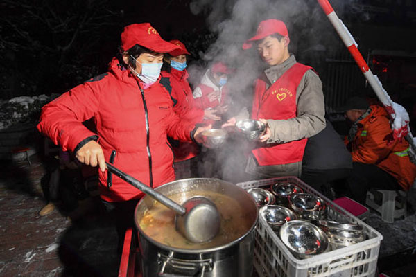 图说:在郑州市广电南路爱心粥屋,志愿者在为环卫工人分发早餐(11月23日摄)。图片来源:新华社