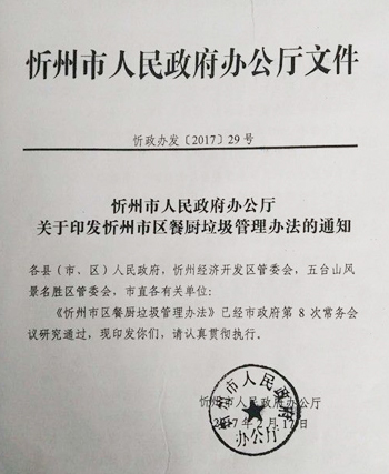 第四条市住建局是市区餐厨垃圾管理的主管部门,忻府区住建局、忻州开发区建设环保局在市住建局的统一指导协调下做好各自责任区内餐厨垃圾的行政管理工作。市环卫处和忻府区环卫管理中心、忻州开发区综合监察大队是市区餐厨垃圾的具体管理部门,负责本责任区内餐厨垃圾的分类收集、运输和处置的监督管理工作。同时,市环卫处要对市区范围内的所有餐厨垃圾管理工作进行统筹协调指导。