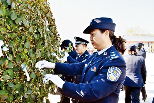在烈士纪念碑前,大家重温了入党誓词,许下庄严神圣的诺言,向革命烈士纪念碑敬献花圈,集体脱帽低头默哀,缅怀革命先烈勇于拼搏、甘于奉献的崇高品质。民警们参观了烈士纪念碑,了解烈士事迹,并纷纷将胸前的小白花挂到了纪念碑旁边的树上,表示要牢记人民警察的神圣誓言和庄严使命,践行“忠诚、为民、公正、奉献”的人民警察核心价值观,传承革命烈士的精神和情怀,履行好维护社会和谐稳定的职责,以饱满的热情和昂扬的斗志为公安事业贡献自己的全部力量。(鲁明强 刘慧云)