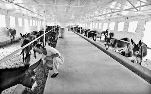 河曲县楼子营镇柏鹿泉村驿腾养殖专业合作社由致富带头人赵志文2017年9月创办,主要从事肉驴养殖,该合作社采取“合作社+贫困户”的产业发展模式,贫困户每养一头驴固定收益1180元,有效带动当地和周边30个村439户823人增收致富。目前,现存栏肉驴600头,年盈利70余万元。图为一名饲养员在为驴添加饲草。(邬耿杰 摄)