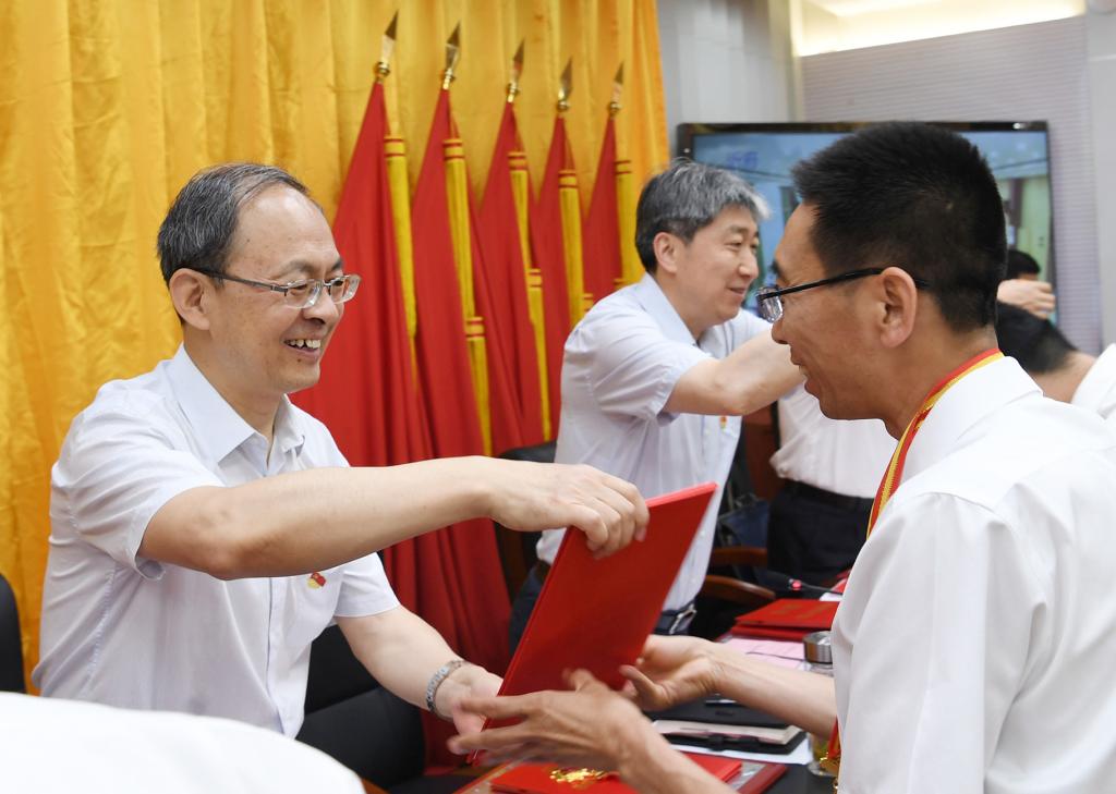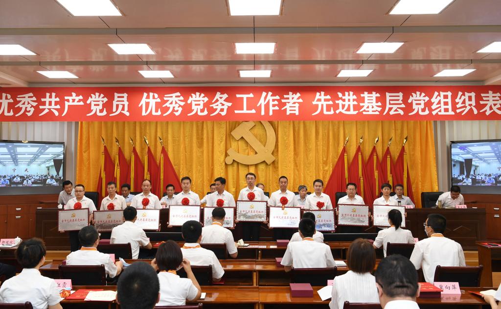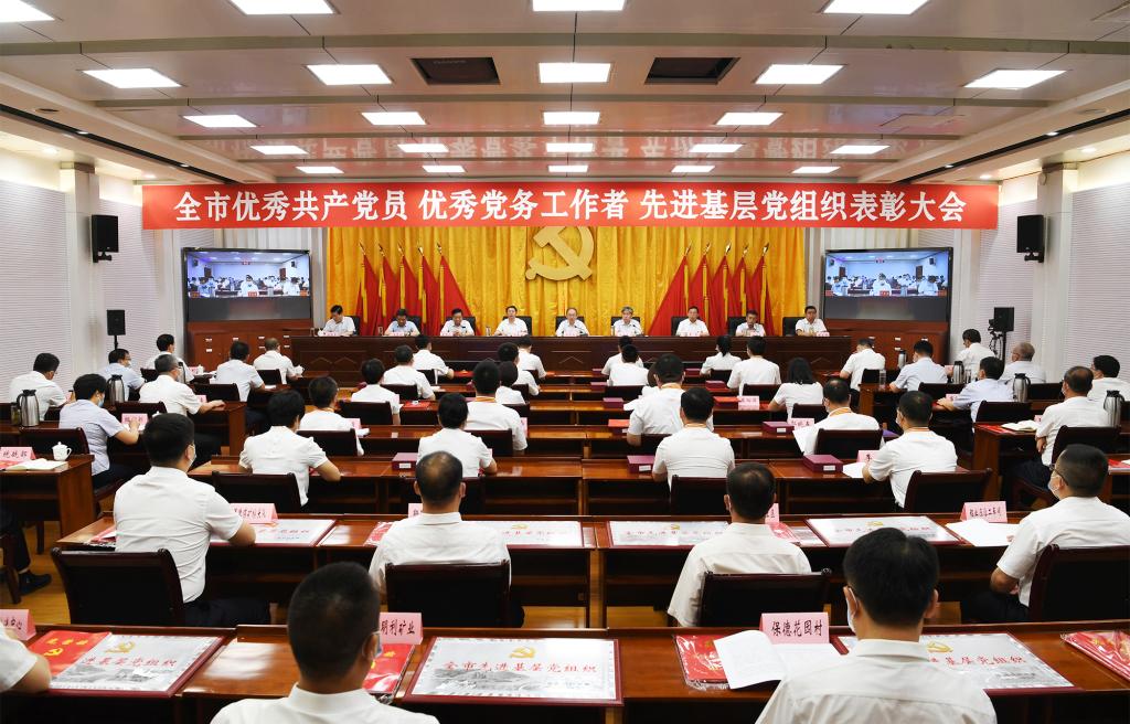 上午8时30分,大会正式开始,全体起立,奏唱国歌。来自全市各行各业、在工作中取得优异成绩的99名共产党员、100名党务工作者和100个基层党组织,分别被授予“全市优秀共产党员”“全市优秀党务工作者”“全市先进基层党组织”荣誉称号。受到表彰的优秀个人和先进集体代表先后上台领奖,会场响起热烈掌声。