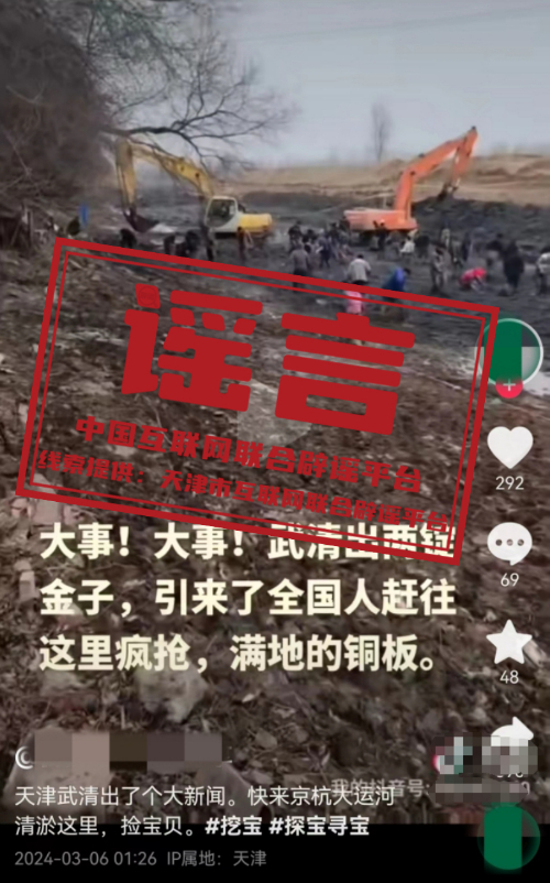 真相:近日,网上有消息称,天津市武清区北运河城区段清淤“挖出两锭金子”“满地的铜板”。经相关部门核实,不存在挖出金子、古钱币一事,该工程前期已经考古部门现场勘测,未发现文物古迹。武清区相关部门提示,严禁任何无关人员在施工区域内滞留,严禁私挖乱采,严禁在施工区内进行所谓的“寻宝”,如不听劝阻将依法追究法律责任。(来源:天津辟谣)