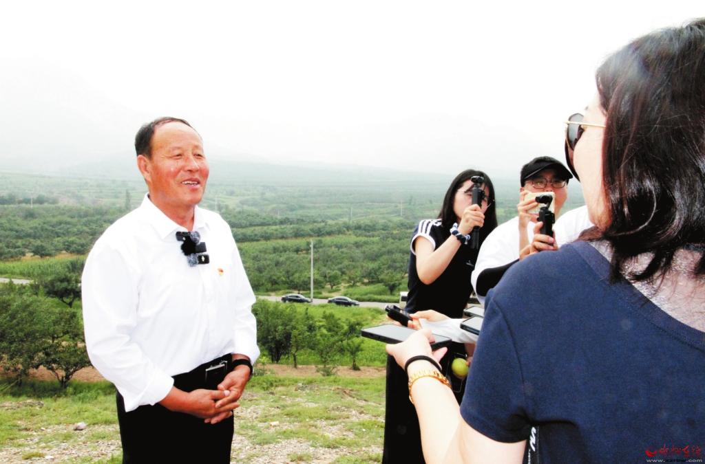 在万亩玉露香酥梨基地观景台上,栗翠田(左一)接受“三晋人大代表采风行”记者采访张林泉摄