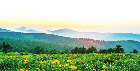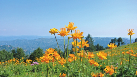 五台山的生态魅力,始于其独特的“垂直生命带”。从山脚的农垦带向上,山地落叶阔叶灌丛、针叶阔叶混交林、寒温性针叶林、亚高山灌丛依次铺展,最终在山顶形成亚高山草甸,构成“一山存四季,十里不同天”的生态奇观。作为华北地区典型的山地草甸,盛夏时节金莲花、苔草等几十种植物肆意绽放,宛如金色星河落满翠绿地毯。