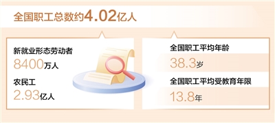 本报北京3月26日电 (记者易舒冉)记者日前从中华全国总工会获悉:第九次全国职工队伍状况调查已于近期结束,调查表明,目前全国职工总数4.02亿人左右,新就业形态劳动者8400万人,农民工2.93亿人;职工平均年龄38.3岁、平均受教育年限13.8年。调查还显示,职工理想信念更加坚定,主人翁地位持续巩固,越来越多的职工积极投身“当好主人翁、建功新时代”“建功‘十四五’、奋进新征程”等主题劳动和技能竞赛。