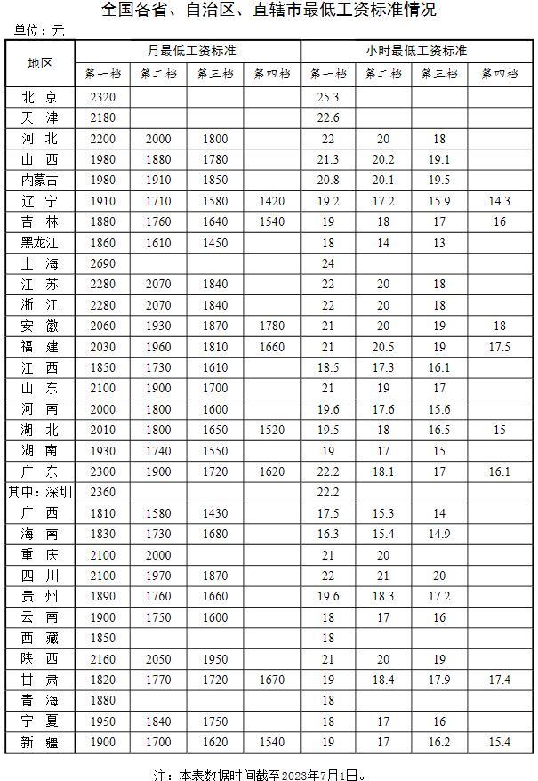 最新的最低工资表出炉。