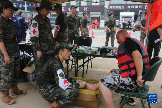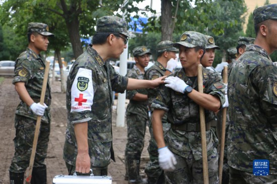 8月6日,武警河北总队医院巡诊组在河北涿州阳光大街清理淤泥点位询问战士伤情。新华社发(杨雪乾 摄)
