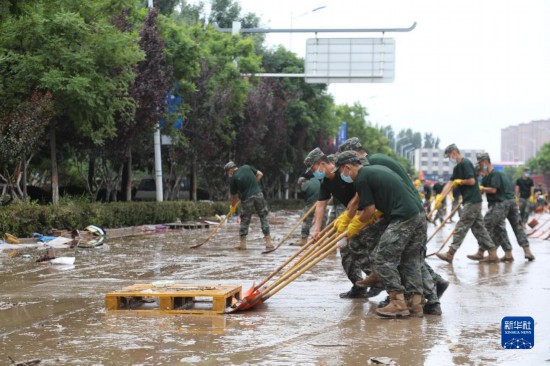 8月6日,武警河北总队机动支队官兵在河北涿州腾飞大街范阳路至朝阳路段清淤清障。新华社发(赵佳亮 摄)