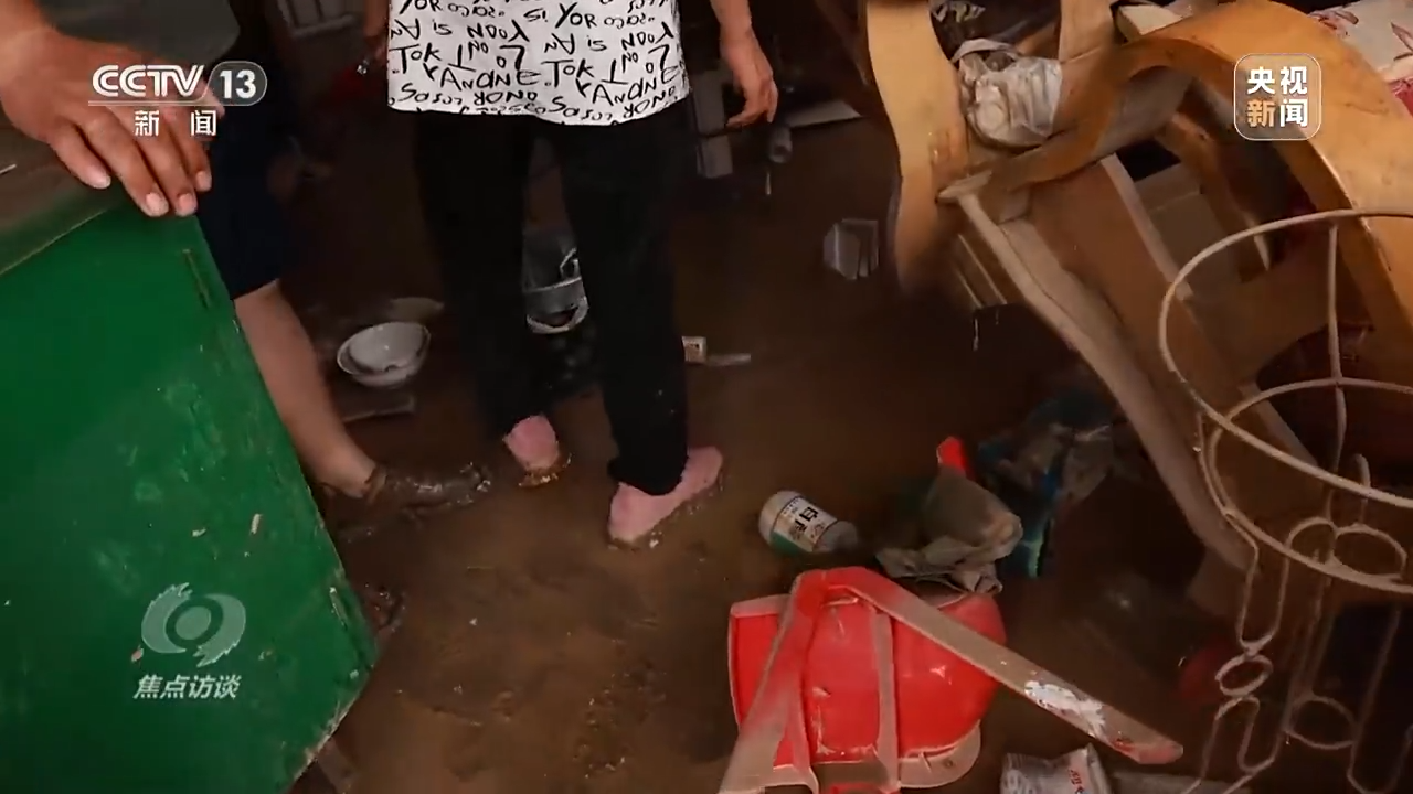 村里的地面很湿滑,淤泥中还夹杂着洪水冲下来的杂物,很容易扎脚。这两天,乔联杰就穿着这么一双拖鞋来回跑,他的雨鞋给了村民。