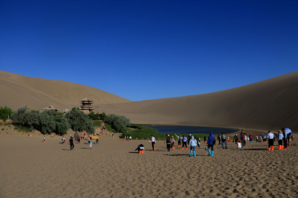 从敦煌市区出发,向南行走5公里,就到了鸣沙山下。起伏黄沙勾勒出一道道利落的曲线,三面沙山环抱,突现一泓月牙形状的清泉,水波荡漾,鱼翔浅底。
